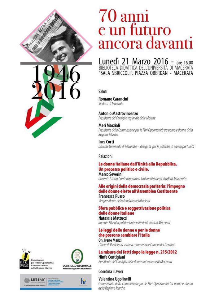 Il Dipartimento SPOCRI dell'Università di Macerata promuove - insieme al Consiglio Regionale-Assemblea legislativa delle Marche e la Commissione per le Pari Opportunità tra uomo e donna della Regione Marche - l'evento pubblico "70 anni e un futuro ancora davanti".